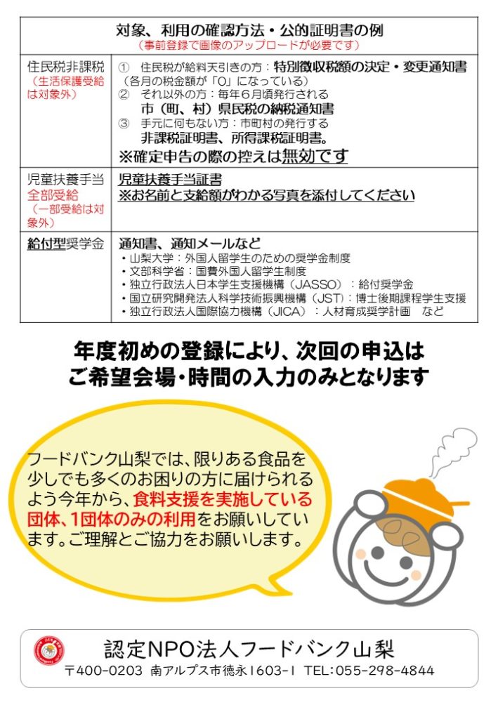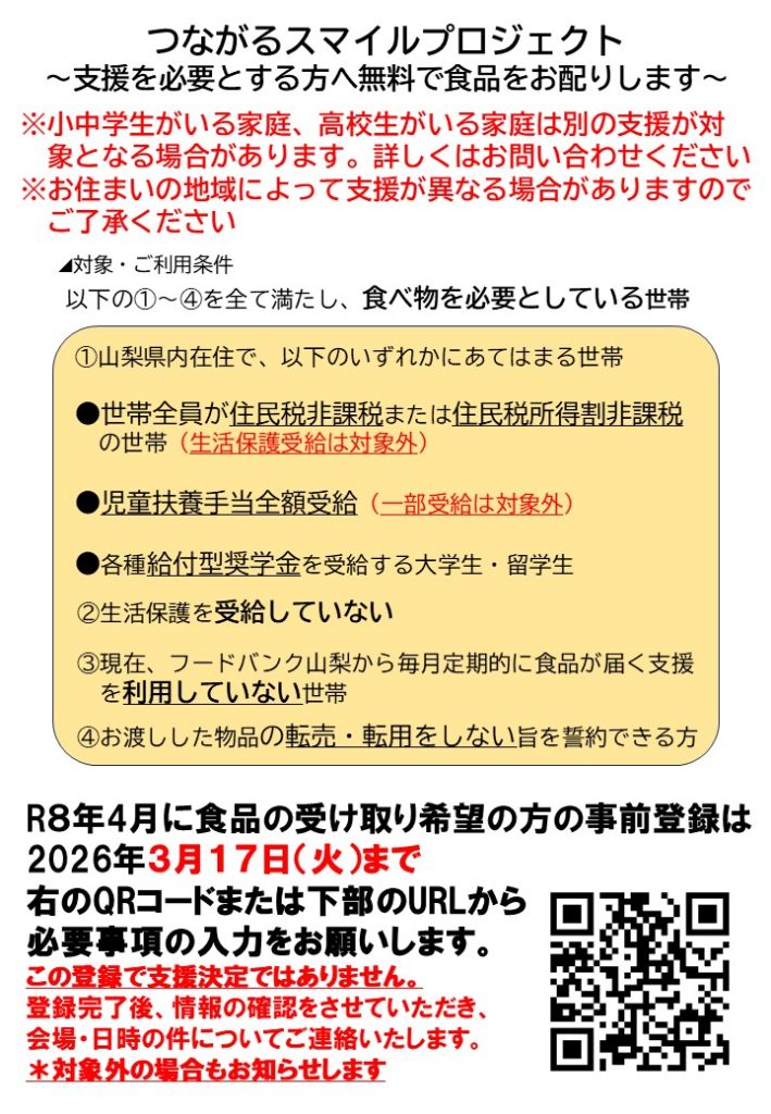 2026年4月の食品配布◆第34回つながるスマイルプロジェクト◆ ◆第34回つながるスマイルプロジェクト◆ 対象の世帯へ無料で食品を配布するプロジェクトです。 食品を受け取るには、下記より注意事項を確認いただいた上で 事前登録が必要です。 ★専用申込フォーム:事前登録はこちらからお願いします →→ https://forms.gle/iVsK5JMbHnbDAQMHA 4月の食品配布を希望の方の事前登録は、【3月17日(火)】が締め切りです。 わからないことがありましたら、フードバンク山梨までご連絡ください。 ☎055-298-4844(平日8:30~17:30) 関連記事 01 令和6年能登半島地震 災害支援拠点の整備 一般社団法人全国フードバンク推進協議会加盟の各地のフードバンク団体と一緒に、石川県穴水町に災害支援の物資の受入、保管、配布するための拠点の稼働に向けた準備をしました。 山梨英和大学ボランティアサークルの皆様からの贈り物 山梨英和大学のボランティアサークル The Peace Fellows の皆様より、乳幼児のいるご家庭へ、お手紙とともにペーパークラフト、紙せっけん、パックご飯をご寄贈いただきました。 乳幼児のいるご家庭に […] 09 「遺贈寄付」サポート窓口にお気軽にご相談ください みなさんこんにちは。 9月13日は「国際遺贈寄付の日」。 また9月11日~17日は「遺贈寄付ウィーク」です。 ご自身やご家族の思いを後世につなぎ、亡くなった後も、その願いを実現する手段のひとつとして「遺贈寄付」があります […]