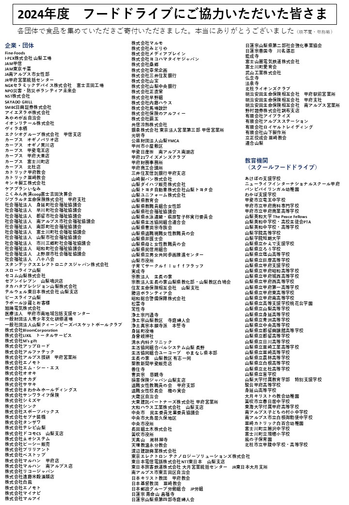 ♦障害者支援施設 千代田荘 ♦東京エレクトロン テクノロジーソリューションズ㈱ ♦㈱保険のアルフィー ♦グレートインフォメーション㈱ ♦㈱メディアブレイン ♦㈱エノモト ♦㈱ササキ ♦ネッツトヨタ山梨㈱ ♦有限会社ジーネヌコーポレーション ♦旭陽電気㈱ ♦長田組土木㈱ ♦㈱正直堂 ♦㈱内藤ハウス ♦宗教法人生長の家 ♦ジブラルタ生命保険(株)甲府支社 ♦㈱早野組 ♦山梨県庁山梨県議会事務局 ♦㈱クロスフォー ♦本興寺 ♦㈱トーエー食品 ♦生活協同組合ユーコープ ♦生活協同組合パルシステム山梨 ♦武山工業㈱ ♦山梨トヨタ自動車㈱山梨トヨタ会 ♦明治安田生命保険相互会社国母営業所 ♦住友生命保険(相)山梨支社 ♦住友生命保険相互会社塩山支部♦明治安田生命保険相互会社甲府支社 ♦一般社団法人山梨県トラック協会女性部会 ♦甲斐市商工会 ♦七面山敬慎院 ♦公益財団法人YMCA ♦損害保険ジャパン㈱山梨支店 ♦甲府市千塚地区愛育会 ♦JA南アルプス市本所 ♦㈱警備サービス輝 ♦㈱LIXIL トータルサービス ♦話し方教室スピーチ・スピーチ ♦㈱マルハン韮崎店 ♦㈱信玄食品 ♦北杜ライオンズクラブ ♦㈱アルファテック ♦周林寺 ♦日本キリスト教団韮崎教会 ♦カトリック甲府教会 ♦山梨県損保保険代理業協会 ♦㈱テレビ山梨 ♦浄土宗山梨教区寺庭婦人会 ♦㈱サンベール♦下鍛冶屋町自治会 ♦極楽寺 ♦野村證券㈱秋田支店 ♦ケアプランいなみ ♦損保ジャパン㈱山梨甲府支店 ♦菅沼農園 ♦あけぼの医療福祉センター ♦㈱YSKe-com ♦カフェMOALA ♦JA共済連-山梨 ♦ファスフォードテクノロジ労働組合 ♦甲府建設組合 ♦加藤隆博事務所 ♦連合山梨西部地域協議会 ♦積水ハウス㈱山梨支社 ♦さわかみ投信㈱ ♦住友生命保険相互会社山梨支店峡北支部 ♦天理教温永分教会 ♦都留組仏教壮年会連盟 ♦武山工業㈱ ♦日本キリスト教団 甲府教会 ♦日本コーバン㈱♦山梨電子工業㈱♦甲府商工会議所 ♦ボーイスカウト甲府第3団 ♦㈱みどりや ♦カトリック韮崎教会 ♦結の家 ♦アンブローズ アンド カンパニー㈱ ♦スローライフ山梨 ♦東日本電信電話㈱NTT東日本山梨支店 ♦住友生命保険相互会社甲斐支部 ♦㈱甲斐ユニオン ♦㈱羽黒工業 ♦有限会社ロイヤルトレイディング ♦カトリック富士吉田教会 ♦松雲寺 ♦ジャパンシーズニング山梨支店 ♦㈱アートコーヒー ♦ ㈱ケイティケイ ♦NGKセラミックデバイス㈱富士吉田工場 ♦日蓮宗弘經山法源寺 ♦一貫道天軒仏堂 ♦㈱マルハン南アルプス店 ♦㈱マルハン甲府店 ♦有限会社 前島園芸 ♦第四部寺庭婦人会 ♦山梨ヤクルト販売㈱みだいセンター ♦都留市食生活改善推進委員会 ♦㈱日鉄日立システムエンジニアリング ♦徳永区自治会 ♦本照寺 ♦南アルプス市シルバー人材センター ♦タカハタプレシジョン山梨㈱ ♦浄土真宗本願寺派本誓寺 ♦芦安ファンクラブ ♦韮崎ライオンズクラブ ♦㈱野村ファンドテクノロジー ♦山梨県西部地区郵便局長会 ♦昭和総合警備保障㈱ ♦南アルプス棚田を愛する会 ♦山梨ダイハツ販売㈱ ♦身延町役場 ♦富士河口湖町役場 ♦中央市民生委員児童委員協議会 ♦南部町社会福祉協議会 ♦早川町社会福祉協議会 全113社・団体