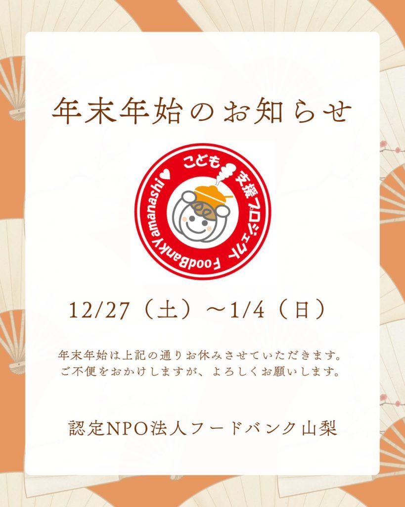 さて、フードバンク山梨は下記の日程でお休みをいただきます。